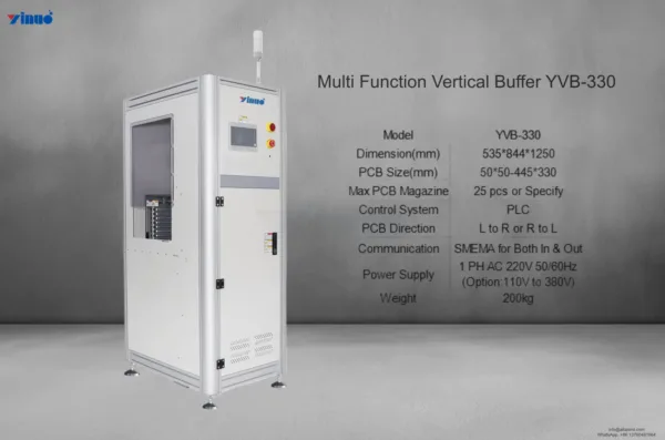 Ideal for electronics, LED, automotive, and communication product manufacturing, the SMT Multi Function Vertical Buffer YVB-330 delivers reliable performance, flexible operation, and long-term stability, making it an indispensable component of automated SMT handling systems.