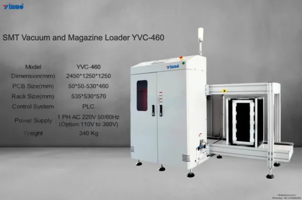 With its versatility and durability, the YVC-460 accommodates a wide variety of PCB sizes and magazine formats, making it suitable for diverse manufacturing needs. By automating PCB loading and magazine management, the SMT Vacuum and Magazine Loader YVC-460 significantly improves production efficiency, enhances workflow reliability, and ensures consistent, high-precision PCB handling throughout the SMT process.