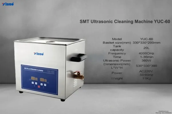 説明: SMT超音波洗浄機 YUC-60 YUC-60は、PCBステンシル、ノズル、その他のSMTツールを洗浄するための、高速、高精度、そして信頼性の高いソリューションです。高度な超音波技術を活用し、繊細な部品を保護しながら、はんだペーストとフラックスの残留物を効率的に除去します。コンパクトで操作が簡単で、SMTの大量生産に適したYUC-60は、はんだ付け精度の向上、欠陥の低減、そしてライン全体の効率向上を実現します。.
